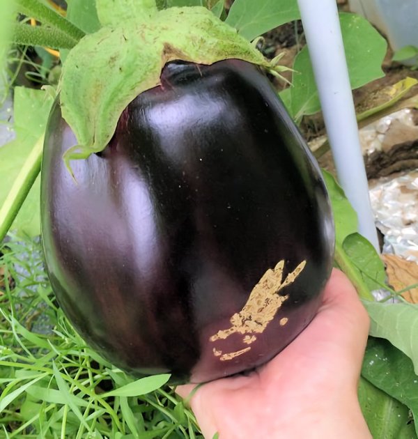 Deep purple teardrop shaped. High yields and drought tolerant Iraqi heirloom. Large fruit, can grow to 3 -4 lbs.