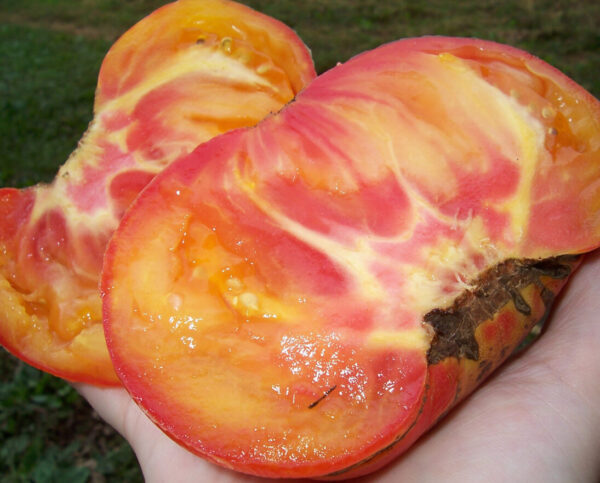 Skip to contentLarge bi-colored beefsteak—yellow color with radiating streaks of red from blossom end. Family heirloom from Minnesota.