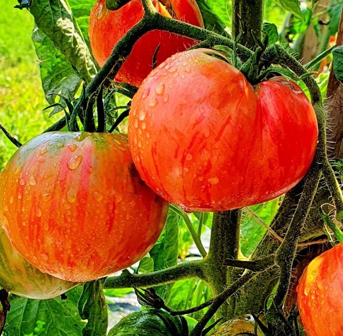 Pink with green-gold stripes on round to oval heart-shaped fruits.  Potato leaf.