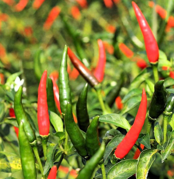 Small 2-4” peppers that retain a bright red color after drying. Prolific on 4 foot tall bush.