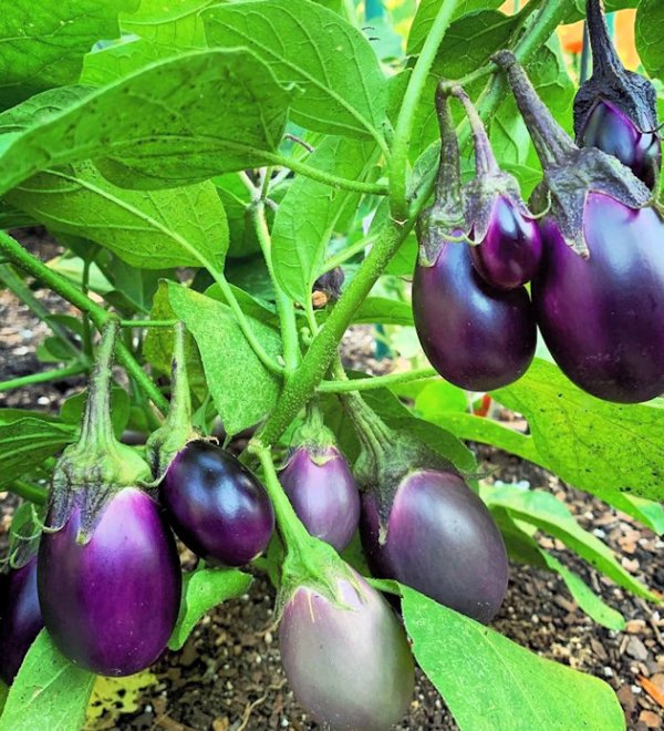 2-3 inch dark purple egg-shaped fruit on compact 24 inch plant. Mild flesh.