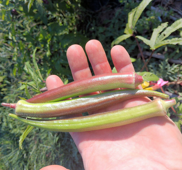 Tall plants with green pods and some blushing. Flavorful. Harvest pods at 6 inches. Some variation in pod characteristics