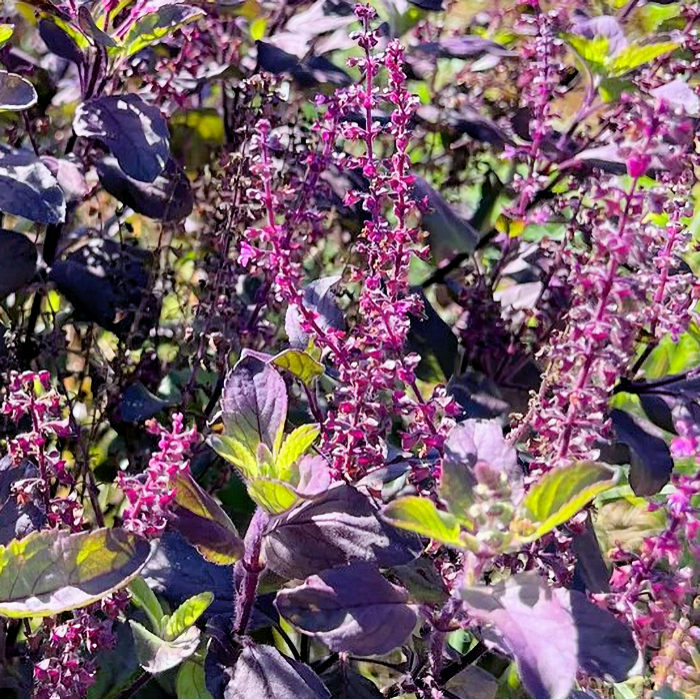 Deep purple and red-leaved Tulsi basil with peppery scent and flavor with hints of cinnamon and clove. Grows to about 2 foot tall bush with woody stems. Generally an annual, but can be grown in containers and brought indoors for the winter.