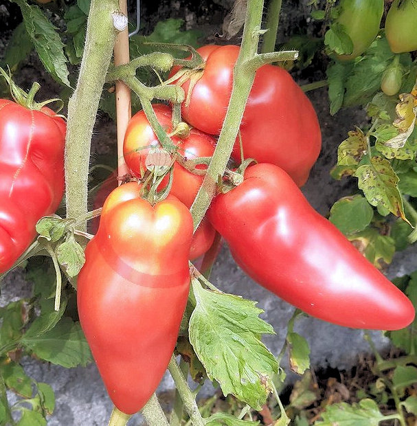 Red cylindrical fruits, some with larger bottoms. Sweet paste tomato. Name translates to “Mystery of Rose Valley.”